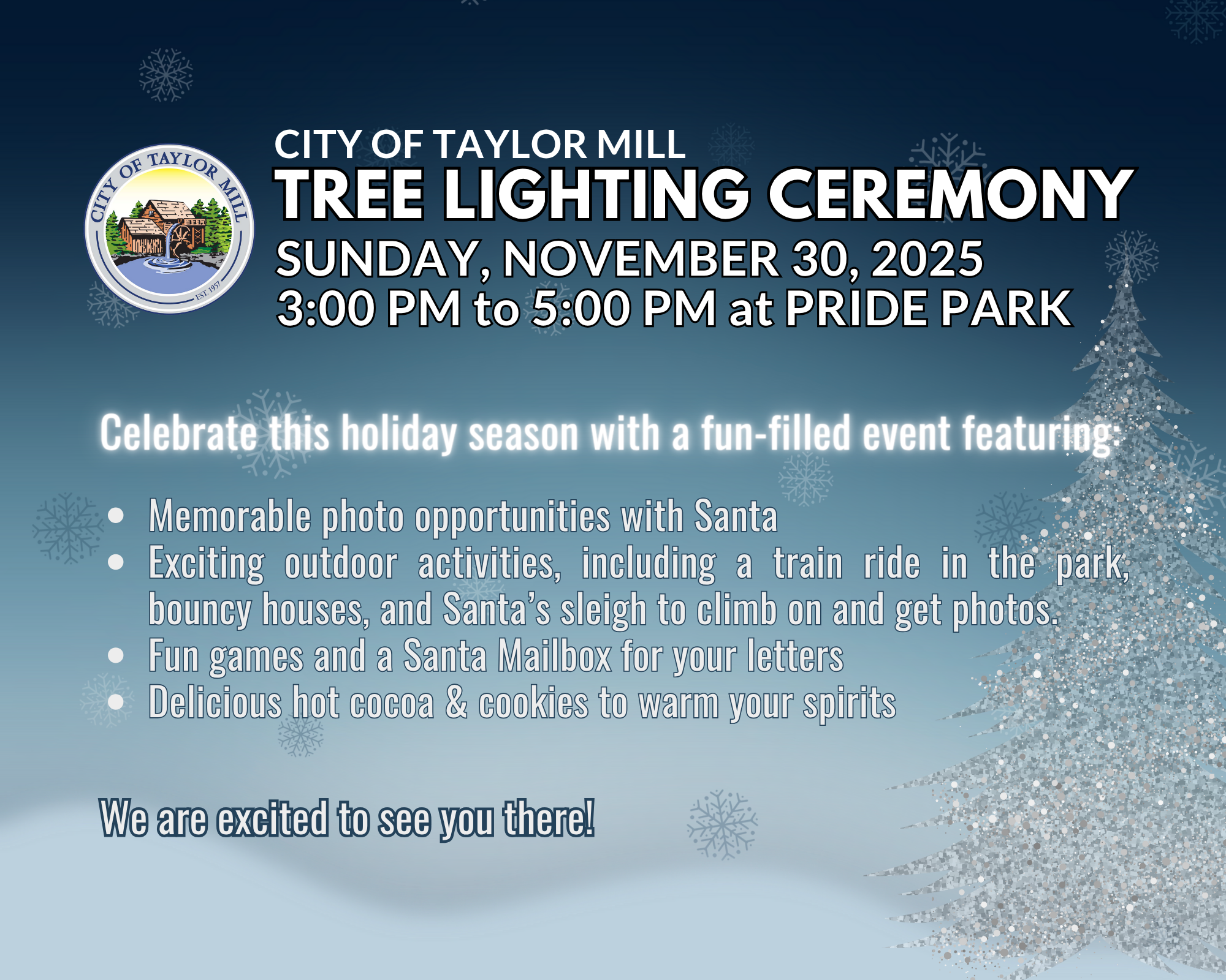 We invite you to the annual Christmas Tree Lighting Event at Pride Park on Sunday, November 30, 2025, from 3 PM to 5 PM. There will be a variety of fun activities for the children to enjoy!