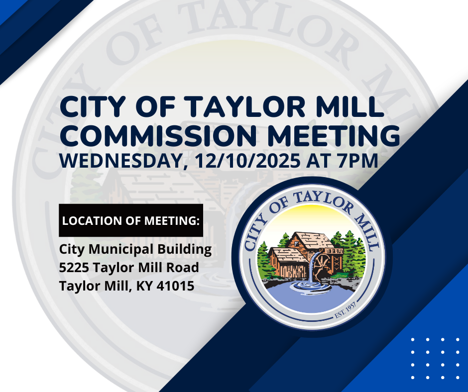 The Taylor Mill Commission Meeting is scheduled for Wednesday, December 10, 2025 at 7 p.m. It will take place at 5225 Taylor Mill Road, Taylor Mill, KY 41015.