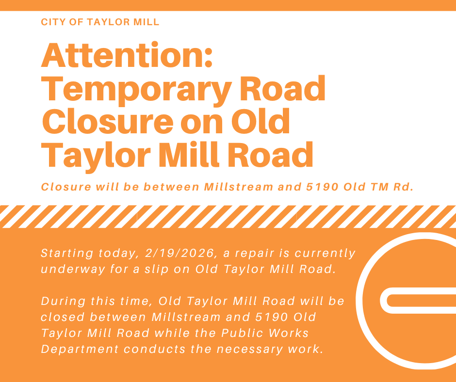 Starting today, 2/19/2026, a repair is currently underway for a slip on Old Taylor Mill Road. During this time, Old Taylor Mill Road will be closed between Millstream and 5190 Old Taylor Mill Road while Public Works conducts the necessary work. Thank you.