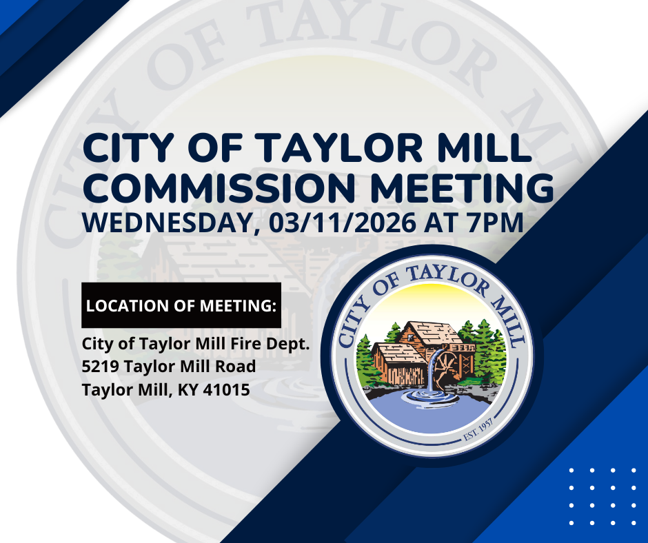 City of Taylor Mill Commission Meeting will be on 3/11/2026 at 7PM: The City of Taylor Mill Commission Meeting is scheduled for Wednesday, March 11, 2026, at 7 PM. It will take place at the TM Fire Station, located at 5219 Taylor Mill Road.
