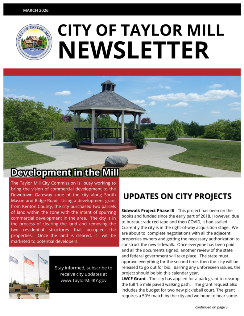 The Taylor Mill Newsletter is Here!: Read all about it! The latest newsletter is available for a read via our website. Newsletter - March 2026